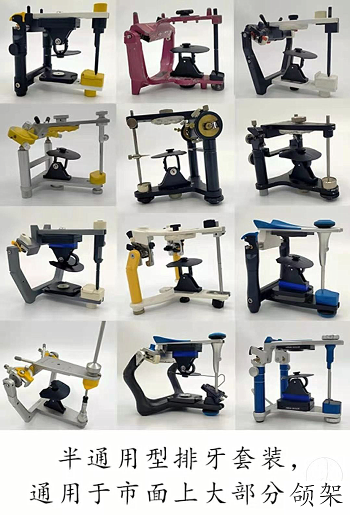 此款排牙导板套装分两种排牙导板的款式。以适应不同的需求,同时中间的调节还可以90度转换使用,这样可以满足不同高度的平均值颌架半可调颌架全可调颌架使用。